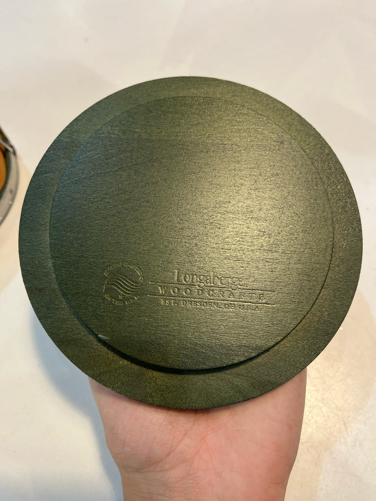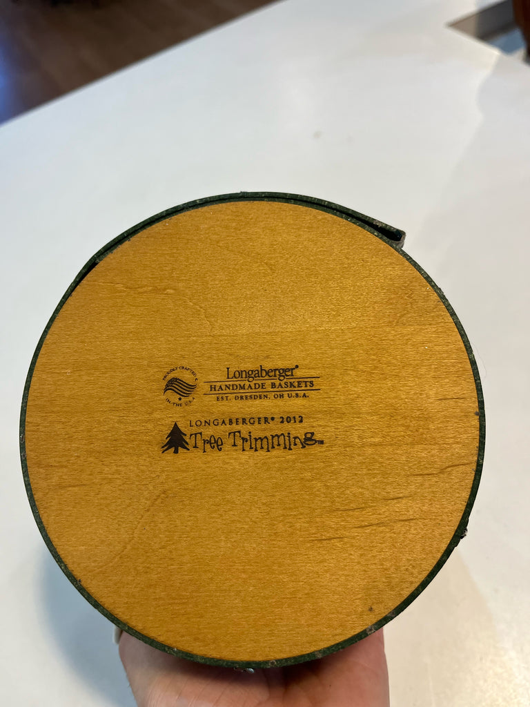 Longaberger "Little Drum" 2012 Tree Trimming Green Lidded Round Basket, embroidered fabric lining, 5"D x 3"H