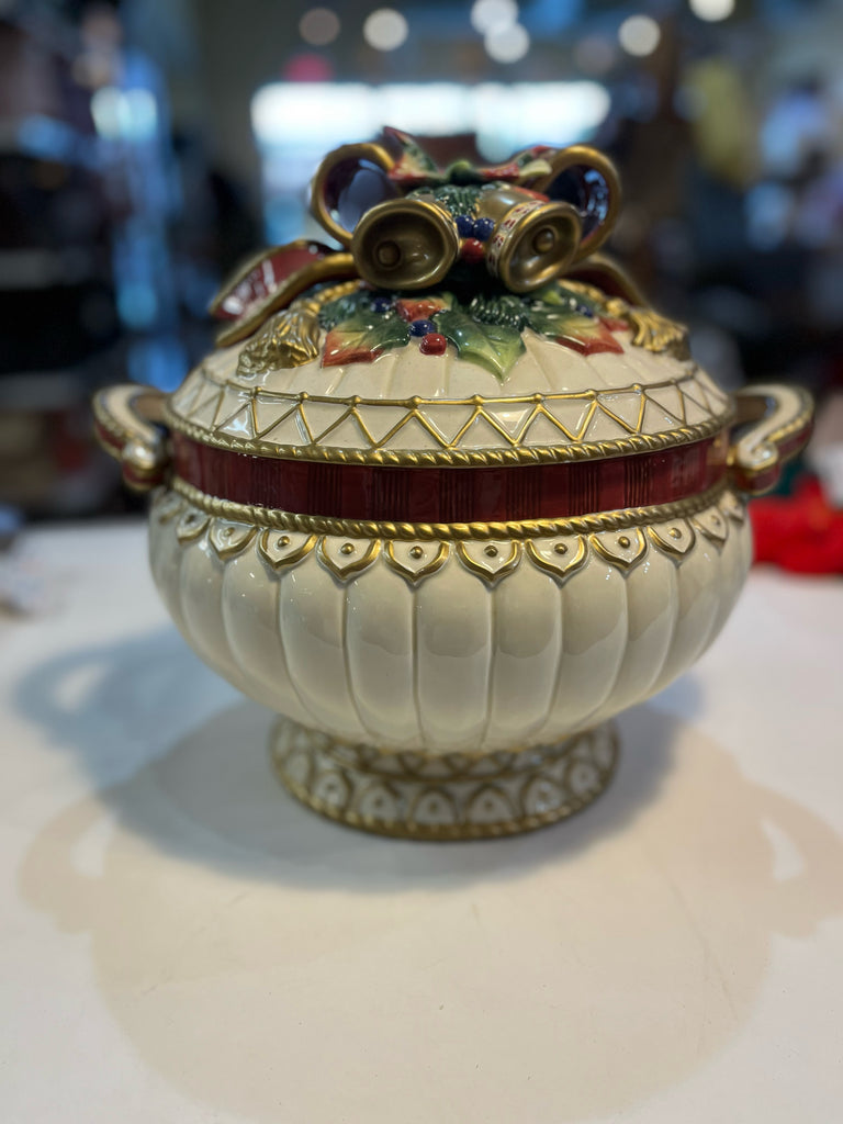 Fitz & Floyd Jingle Bells & Bows Florentine Classics Christmas Punch Bowl, NQP-no laddle, 13"L x 11.5"H