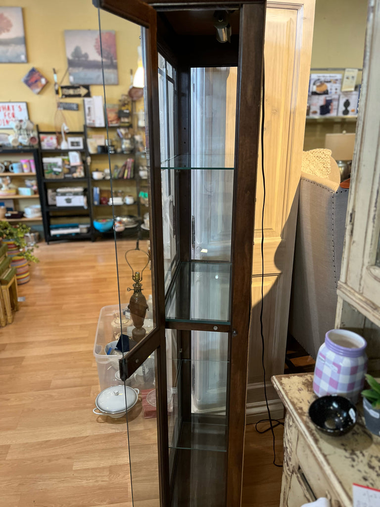 Glass Front Curio Cabinet, light-up, 5 shelves, mirrored back, 22"L x 11"W x 71"H