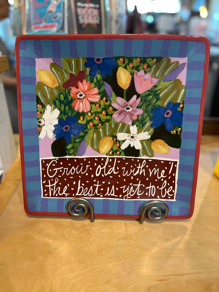 "Grow old with me! the best is yet to be" Plate by Droll Designs w/ stand, 14"L x 14"H